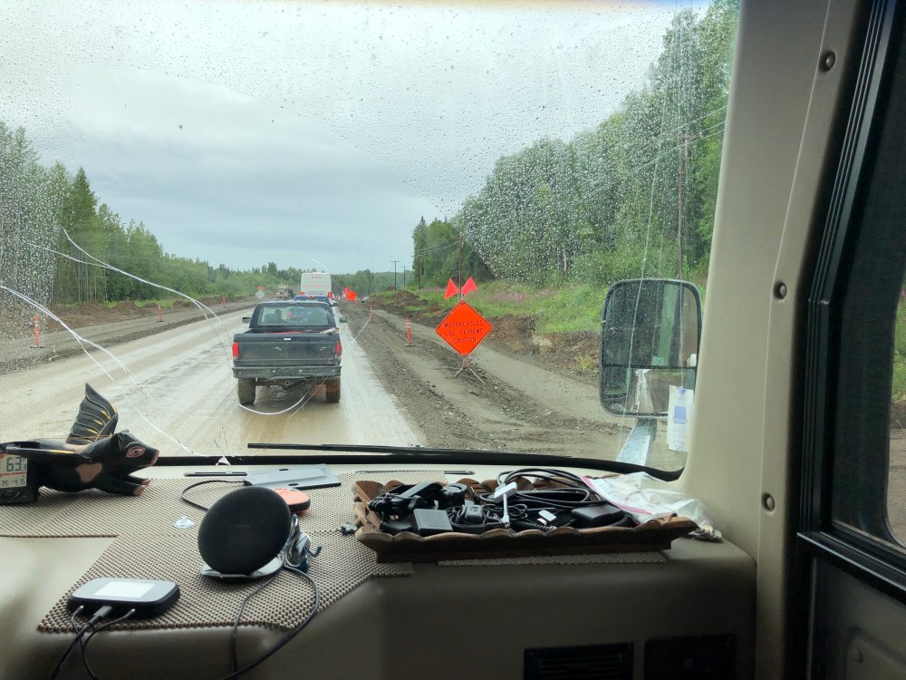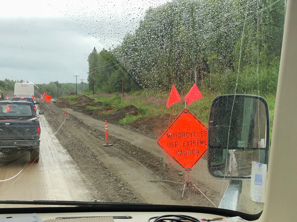 Left Anchorage this morning to head north, and we were treated to 2 of Alaska’s specialities- rain and road work! What a mess! About 10 or so miles of the Parks Highway was being rebuilt just south of Talkeetna. Mud and gravel made traffic slow. It stopped at times and there were major drop offs at the shoulders. We’ve seen many motorcycles on this trip but we were glad to not see any on this stretch of road. It wouldn’t have been a pretty sight.