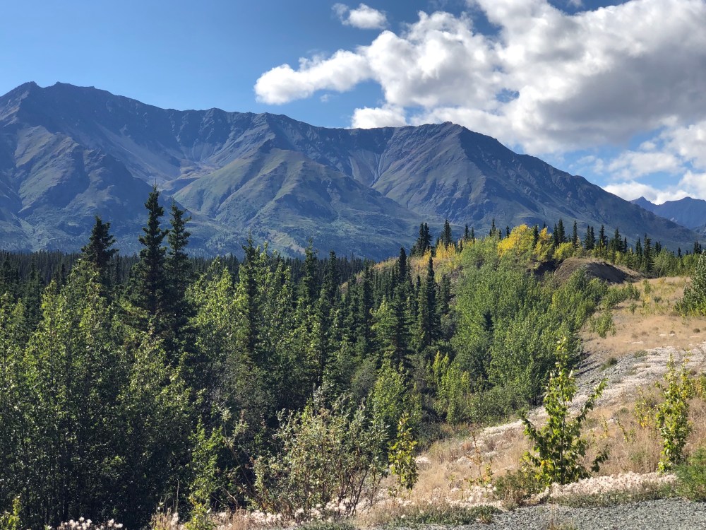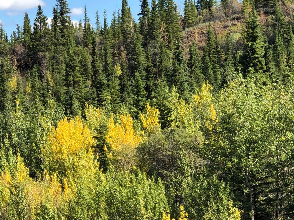 Crossed the boarder into Canada today. This is the same route we took on the way up, but we noticed some changes in just the 3 1/2 weeks since we were here before. The road seems better, and while some of that may be due to our getting used to the potholes, Frost heaves, and occasional gravel, we know they’ve also been working on making repairs. We also noticed that the fireweed flowers along the roadside had lost their purple bloom and some of the trees are beginning to change to fall colors.