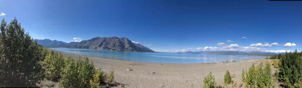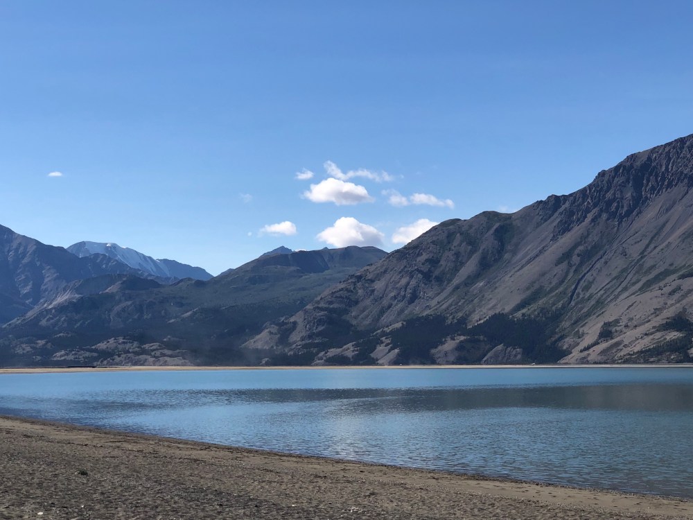 Today’s route took us by Kluane Lake. On the way up it was windy and there was sand in the air, making it difficult to see. This time it was clear and beautiful.