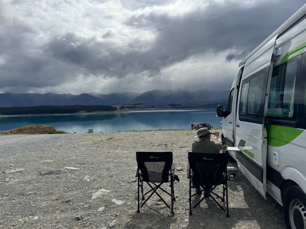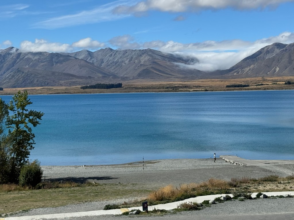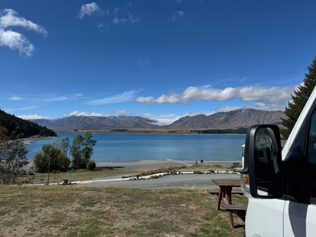 Arrived at Lake Pukaki Sunday night, 3/23, in time to get a spot at The Pines – the most popular free camping area in the South Island. Gorgeous views of the lake and Mt. Cook. The next day we had planned to try hiking a bit of the famous Hooker Track, but the weather did not cooperate – fog and drizzle all morning. So we continued on to our next stop – Lake Tekapo. We camped at Lake’s Edge Holiday Park – I think we have the best site! Tonight we’re going to an astronomy program offered by The Dark Sky Project in Tekapo. 🤞No clouds!